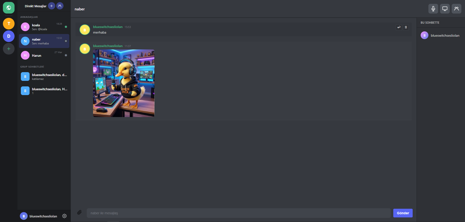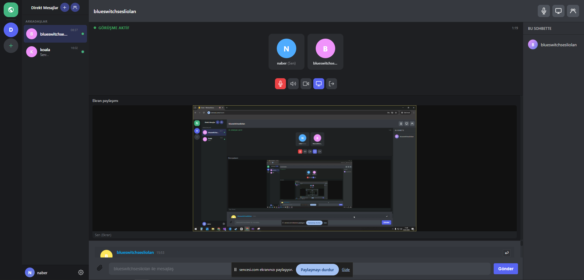 Kendinizi susturma, Kulaklığınıza-Hoparlörünüze gelen sesi susturma, kameranızı açma, ekranınızı paylaşma gibi fonksiyonlar özel mesajlar yani DM'de mevcut.